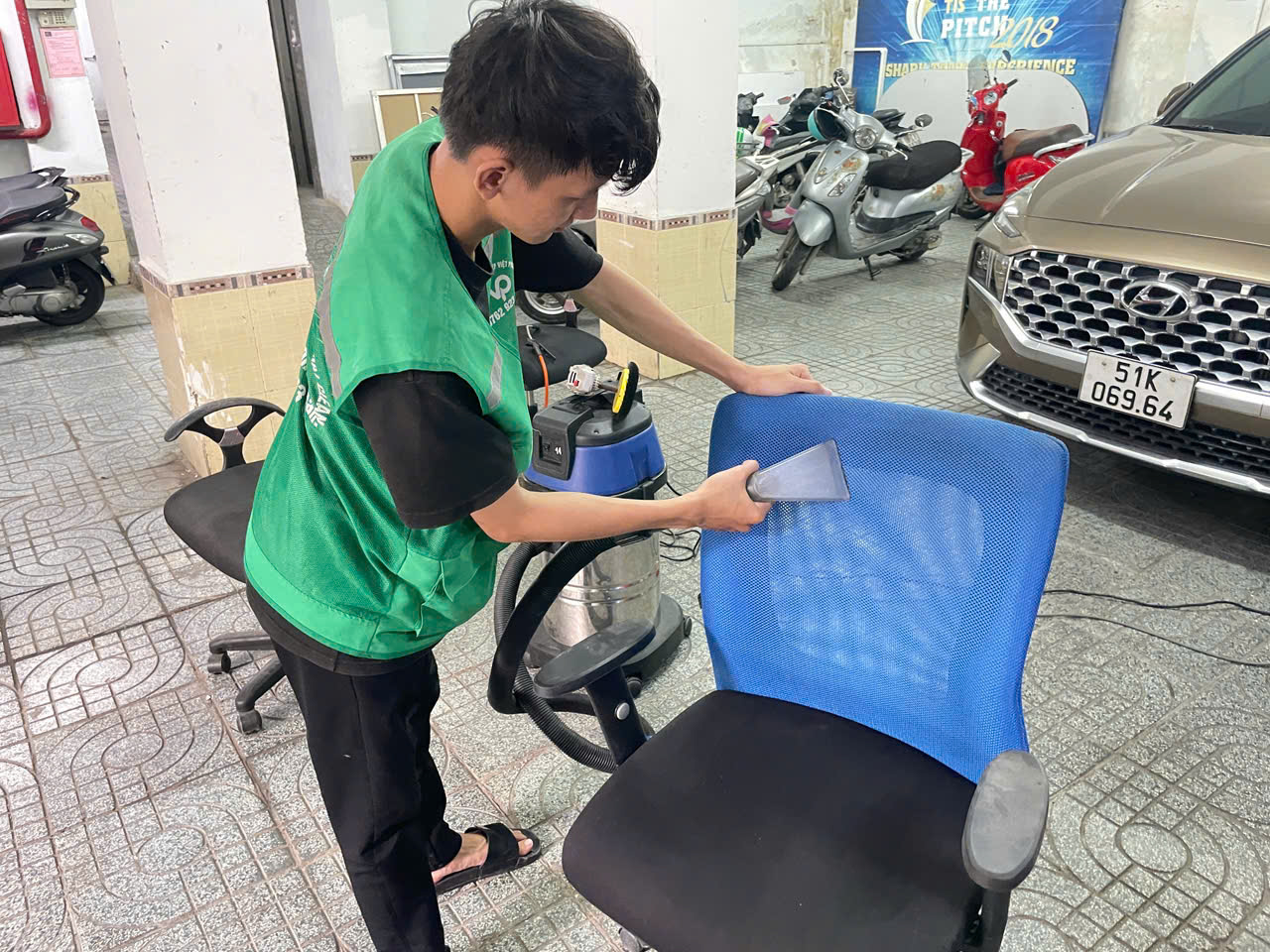 Dùng máy hút công suất lớn để hút toàn bộ hỗn hợp dung dịch + bụi bẩn đã được đánh tan. Bước này giúp ghế khô nhanh hơn, tránh đọng nước gây mùi hoặc làm giãn sợi lưới.